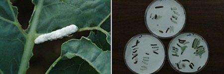 ▲ 파방나방의 애벌레와 노무라이아 균 ⓒ제주농업기술원