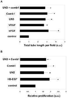 2번째 상처 치유 펩타이드 후보인 ‘UN3’는 정상적으로는 혈소판이 풍부한 혈액 중에 미량 존재하는 2종의 펩타이드(UN1과 UN2)를 기본 골격으로 하여 개발하였다고 한다. UN3는 시험관 시험에서 내피세포 증식을 50%나 늘렸으며, 혈관신생도 250%나 증가시켰으며, 손상에 반응한 세포 이동도 300%나 늘렸다.