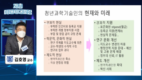 ‘청년 과학기술인(석박사)의 창의적 연구를 위한 현재와 미래’라는 주제로 첫 번째 발제를 맡은 김호영 서울대 교수는 대학원생들이 처한 어려움을 지적하고 “인건비와 등록금 등 경제적인 지원과 함께 지도교수 변경 허용, 연구비 관련 행정 간소화 등 연구문화 개선과 병역특례 확대 등 제도 개선이 필요하다”고 말했다.