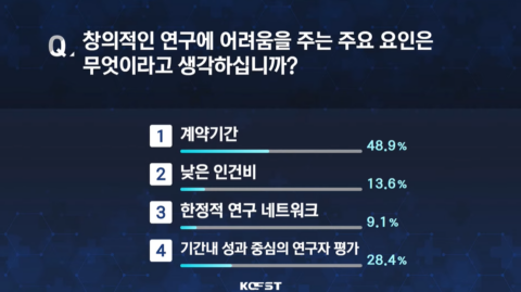 박사 후 연구원의 연구 집중을 위해서는 신분 안정이 시급하다는 의견이 주를 이뤘다. 관객들을 대상으로 한 현장 설문에서도 창의적인 연구에 어려움을 주는 주요 요인으로 48.9%가 ‘계약기간’을, 28.4%가 ‘기간 내 성과 중심의 연구자 평가’를 꼽았다.