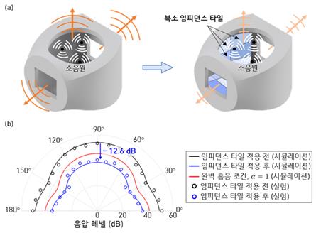 연구팀은 복소 임피던스 타일을 적용, 밖으로 빠져나가는 소리를 90% 이상 저감할 수 있다는 것을 정밀한 전산 시뮬레이션을 통해 예측하고, 제작과 실험을 통해 소음 저감 성능을 검증하는 데 성공했다. 또 구조물 내벽에서 소리를 100% 완벽하게 흡수하는 경우보다도 복소 임피던스 타일을 사용했을 때 밖으로 빠져나가는 소리를 훨씬 더 큰 폭으로 저감할 수 있음을 확인했다.