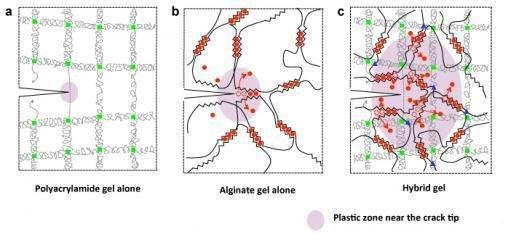 재료를 구성하는 두 젤은 결합 이전에 매우 약한 성질을 갖고 있다. 예를 들어, 알긴산 젤의 신축성은 1.2배 정도이다. 일단 이들을 8대1의 비율로 결합하면, 두 고분자가 서로를 강화시켜 가교 사슬의 복잡한 구조를 형성한다.