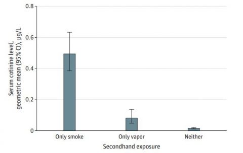 분석 결과 실내 전자담배 증기에 노출된 어린이는 혈중 코티닌 수치가 0.081㎍/L로 간접흡연 노출 어린이(0.494㎍/L)의 6분의 1 정도였지만 두 가지에 노출되지 않은 어린이(0.016㎍/L)보다는 5배나 높은 것으로 나타났다.