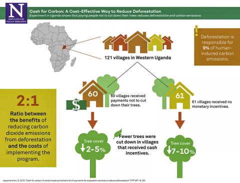 이 연구에서는 우간다의 예를 들었다. 우간다 서부의 60개 마을에서 숲을 소유한 사람들이 삼림을 그대로 유지하고 벌채를 자제할 경우 현금 보상을 받았다. 반면 다른 61개 마을의 삼림 소유자들은 금전적 인센티브를 적용하지 않았다.